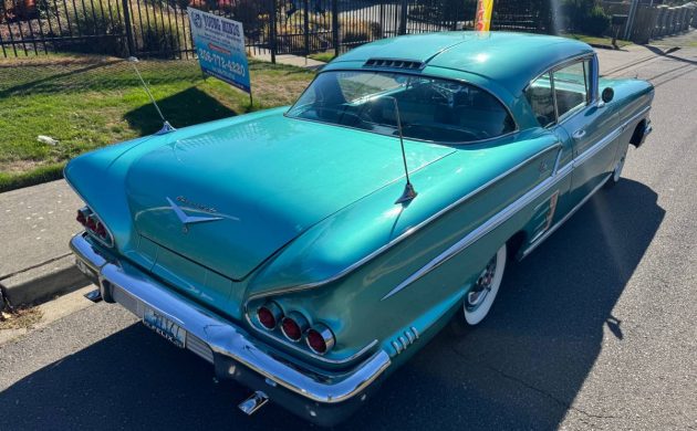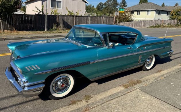 Although the badge first appeared adorning a show car at the 1956 General Motors Motorama, Chevrolet introduced the Impala as its range-topping variant of the Bel Air in 1958 in 2-Door Hardtop and Convertible forms. This Impala rolled off the line that year, and much has changed since. The seller confirms that the car retains all of its original steel and has no history of rust repairs or other issues. It is rock-solid, and the panels show no evidence of bumps or bruises. The Teal Metallic paint is a mystery, as this shade does not appear on that year’s Chevrolet color charts. Given the modifications elsewhere, I’m wondering whether it is the same color used by Ford on the 1993 Mustang SVT Cobra. It could also potentially be an Oldsmobile shade from that year called Allegheny Green Irridescent, but it’s hard to make a definite call from photographic evidence alone. Although not visible in the supplied images, the seller acknowledges minor paint flaws and states that this Impala should be considered an extremely tidy, driver-grade classic. The bright trim looks excellent, and the tinted glass is clear. As befits a luxury car, the Impala wears new Coker whitewalls on steel wheels with spinner hubcaps.