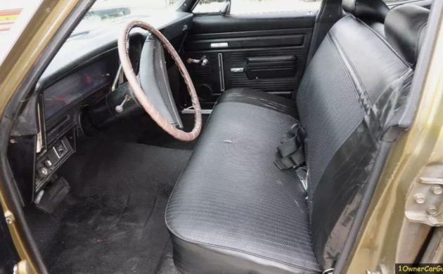 We’re told that the paint has been “spruced up in the past,” so is that another way of saying it wears an older respray? The olive green/brown paint was probably not the most popular Chevy color in 1972. The body is okay, but the seller says there is some indication of prior work. And both bumpers have been pushed in slightly, not enough to warrant being changed if you’re not eyeing a restoration. Two decent-sized rust holes are said to be in the floorboards below the rubber floor coverings (sorry, no carpeting).