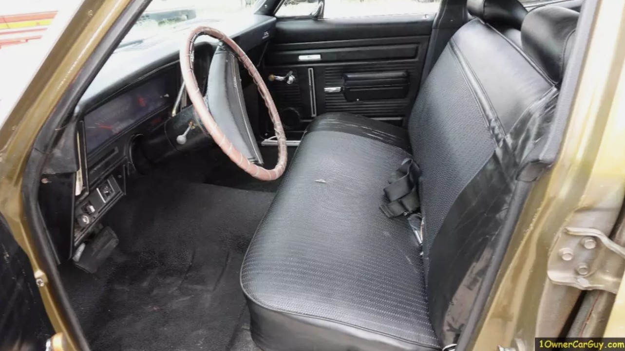 We’re told that the paint has been “spruced up in the past,” so is that another way of saying it wears an older respray? The olive green/brown paint was probably not the most popular Chevy color in 1972. The body is okay, but the seller says there is some indication of prior work. And both bumpers have been pushed in slightly, not enough to warrant being changed if you’re not eyeing a restoration. Two decent-sized rust holes are said to be in the floorboards below the rubber floor coverings (sorry, no carpeting).