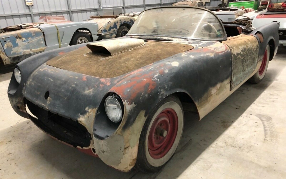 This 1954 Corvette is a work-in-progress. What you see is what you get and if it’s not in the photos, it’s not there. Someone started with a solid body and chassis and began making updates to the car, the most significant being the addition of a 350 cubic-inch crate engine along with a K-case 700r4 automatic transmission. The project comes with a complete exhaust system and a new aluminum radiator (in the trunk). However, the body will need further prepping before paint, an interior will need to be sourced, and the car has yet to be “wired or plumbed.”