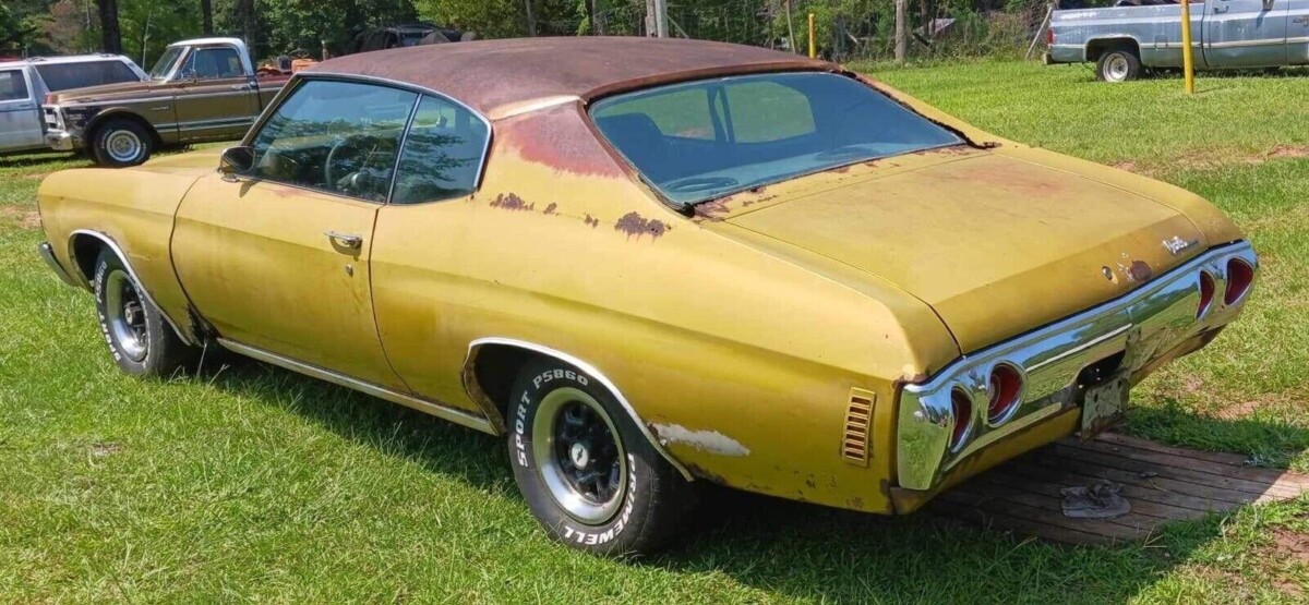 The likely paint color is Sunflower, something of a cross between gold and yellow. There is evidence of where chrome trim pieces would have separated the body from a vinyl roof, likely black but long peeled away. Most of the external sheet metal panels have rust in them, so they will require either patches or replacement depending on the amount of damage. Assuming this automobile is numbers matching, the cost of a complete restoration still may exceed its ultimate value. So maybe the seller was going to slap some SS badges on the car with the LS to help boost its bounty.