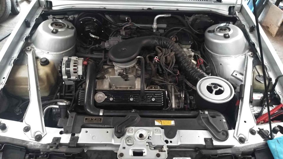 Article states that it was originally a 2.5 Iron Duke with a TH125 three speed automatic. The transmission is still in there. Hmmm.