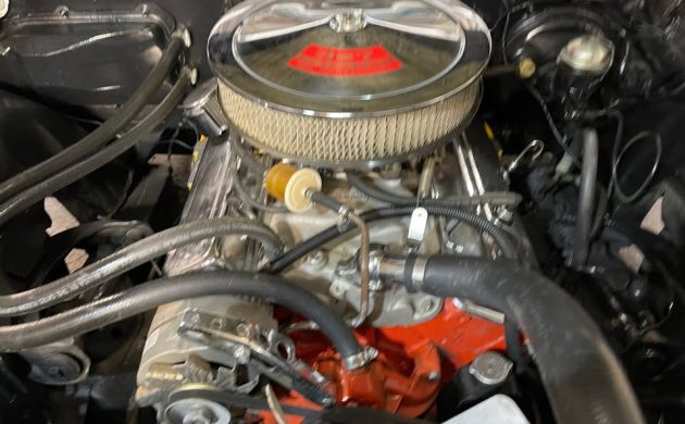 Somebody snagged it – big curb appeal in a tidy package made this a quick sale. Seat covers are reproduction, and transmission pan shape shows it’s a powerglide. Hopefully no hidden bodywork surprises that appear later. I’m thinking price was reasonable. Wheels aren’t a favorite but not hating them…