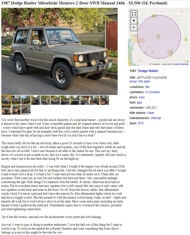Offered for three short years in the U.S. in the late 1980s, Mitsubishi’s Pajeho family was the parent to both the Mitsubishi Montero and the cousin vehicle, the Dodge Raider. This one needs mucho deferred maintenance that’s been skipped since the seller bought it five years ago. They have it posted here on craigslist in Portland, Oregon, and they’re asking $3,500. Here is the original listing, and thanks to Curvette for the tip!