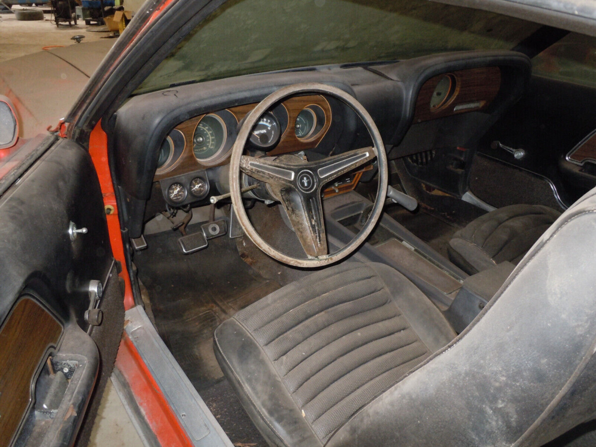The original owner indicated that this Mustang’s Calypso Coral paint is original and that it has no history of any accident damage, rust repair, or restoration work. It has been sitting for three decades, but dry storage has preserved its paint surprisingly well and minimized the impact of rust. The first step would be thoroughly washing this classic because it may produce surprising results. I’m not claiming that this act will return the car to showroom condition, but the paint may present well enough to make the concept of retaining the Mach 1 as an original survivor a viable option. The panels are straight, but the lack of significant rust could be this classic’s ace. There are some small areas in the floors, but these may only require patches rather than wholesale pan replacement. There is also surface corrosion, but the rails and torque boxes look sound. A more detailed inspection reveals minor rust in the trunk drop-offs, the lower rear quarter panels, and the underside of the decklid. The trim may respond positively to some work with a metal polish, while the car retains its original steel wheels and hubcaps.