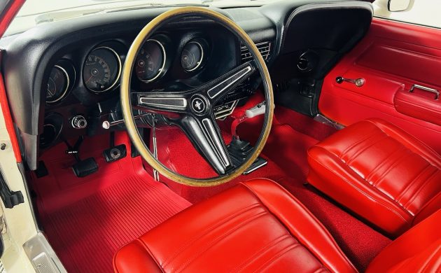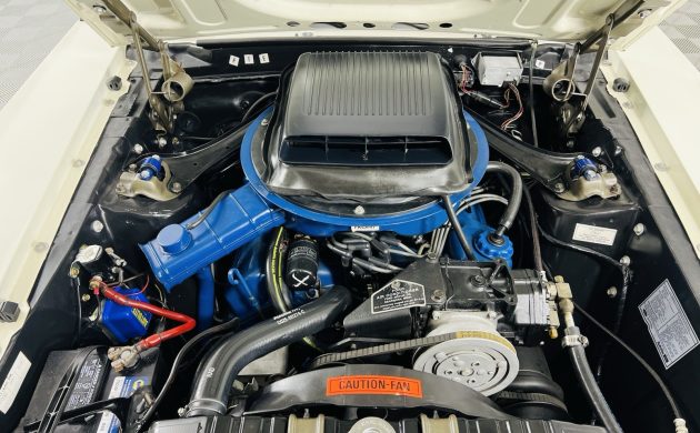Trimmed in Vermillion vinyl, this Mustang’s interior is as impressive as its exterior. There is no evidence of wear or other issues. While it may stretch credibility to describe it as showroom-fresh, its appearance is consistent with a high-end driver that will command plenty of positive comments wherever it goes. The first owner kept ticking boxes beyond the drivetrain, equipping the interior with air conditioning, a rimblow tilt wheel, a factory tachometer, intermittent wipers, and an AM radio. The factory radio has been replaced by an aftermarket radio/cassette player, but reversing that change would be easy if the new owner prefers authenticity.