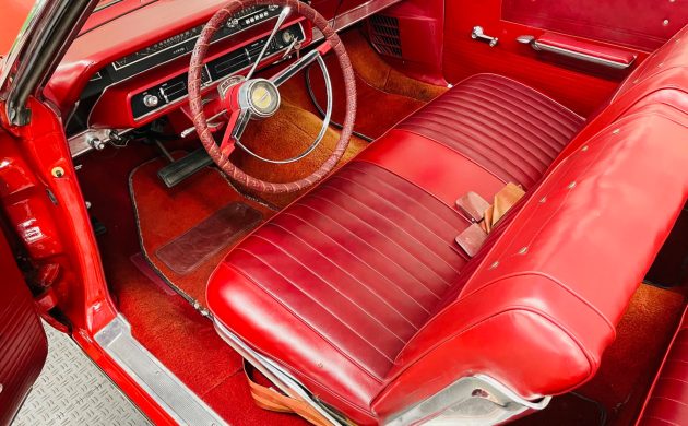What differentiates this Galaxie from most others you’ll find for sale is its clutch pedal; this is a three-on-the-tree car, and the transmission is (thankfully) a fully-synchronized unit designed to survive behind a torquey FE. The interior is immaculate, and although the seller says that it’s all-original, the upholstery is tight enough that I just can’t imagine how it hasn’t been reupholstered at the very least. The door panels and fabrics match period images pretty well, and the only variances I can find are the horn ring bezel and the woodgrain dash insert (which would have been standard on an LTD). The color combination is a handsome one: The aforementioned Wimbledon White with a red interior is a combination that we should still be regularly using on new cars today.