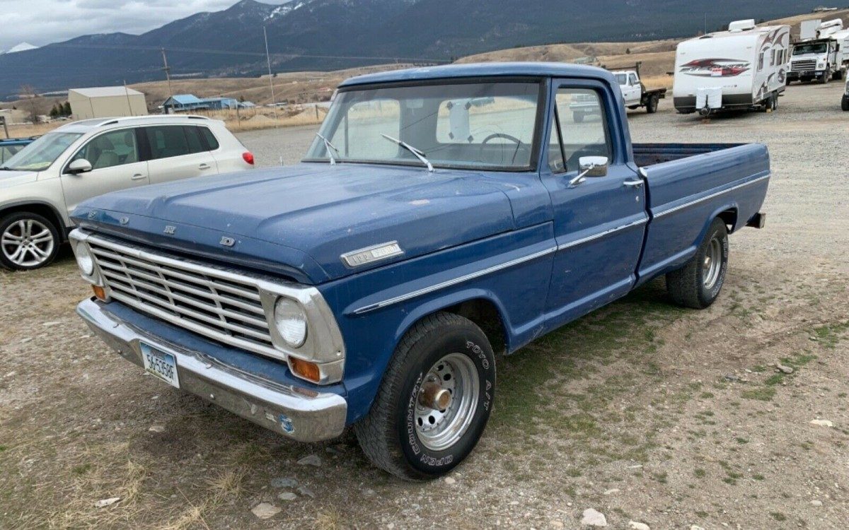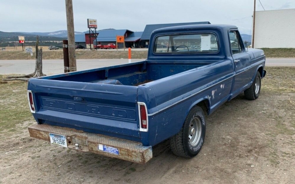 While short wheel base trucks bring more money, it is the long wheel base pick ups that do the work! Larry D. sent us this 1967 Ford F100 long bed pickup to check out. It is for sale here on eBay. There are 2 days remaining in the auction and the bids are only up to $3,000. The F100 truck is located in Eureka, Montana and looks to be a solid driver. This blue truck looks to be fairly original except for the aftermarket wheels and tires.IT is equipped with a V8 engine and 4 speed.