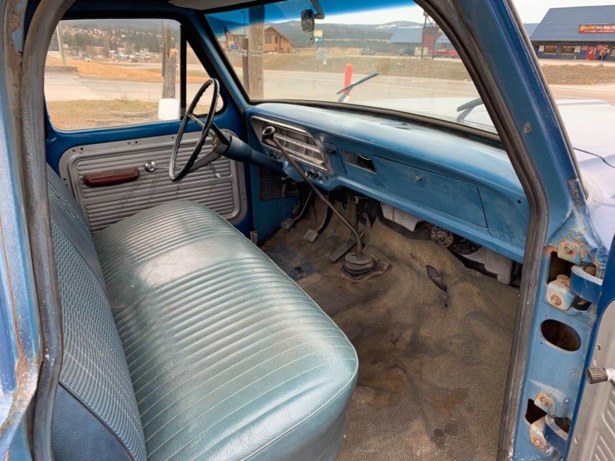 The interior looks pretty good and is the normal spartan, no fluff interior for a base F100 pick up. The F100 denotes that the truck is a 1/2 ton pickup the V8 engine is backed by a 4 speed floor shifted manual transmission. The seat looks good but I am a little confused by the picture because it appears the bottom of the seat is vinyl and the top of the seat is cloth. The ash try in the center of the dash appears to be missing.