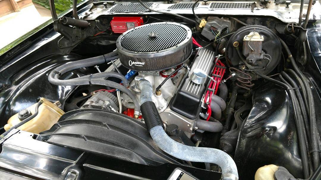 The factory 350 engine has been modified or replaced with this built 355 cid motor. The engine is fed through a Demon 4 barrel carburetor and an aluminum high rise intake manifold. The engine has headers, aftermarket MSD ignition, and an aftermarket air cleaner. The seller states that the car also has new tires and new shocks. There is not much of a description about the engine but it also has aluminum heads.