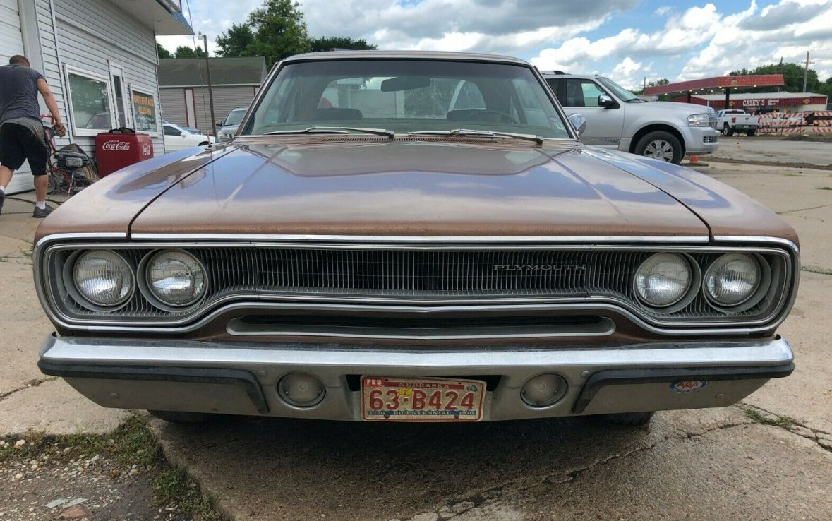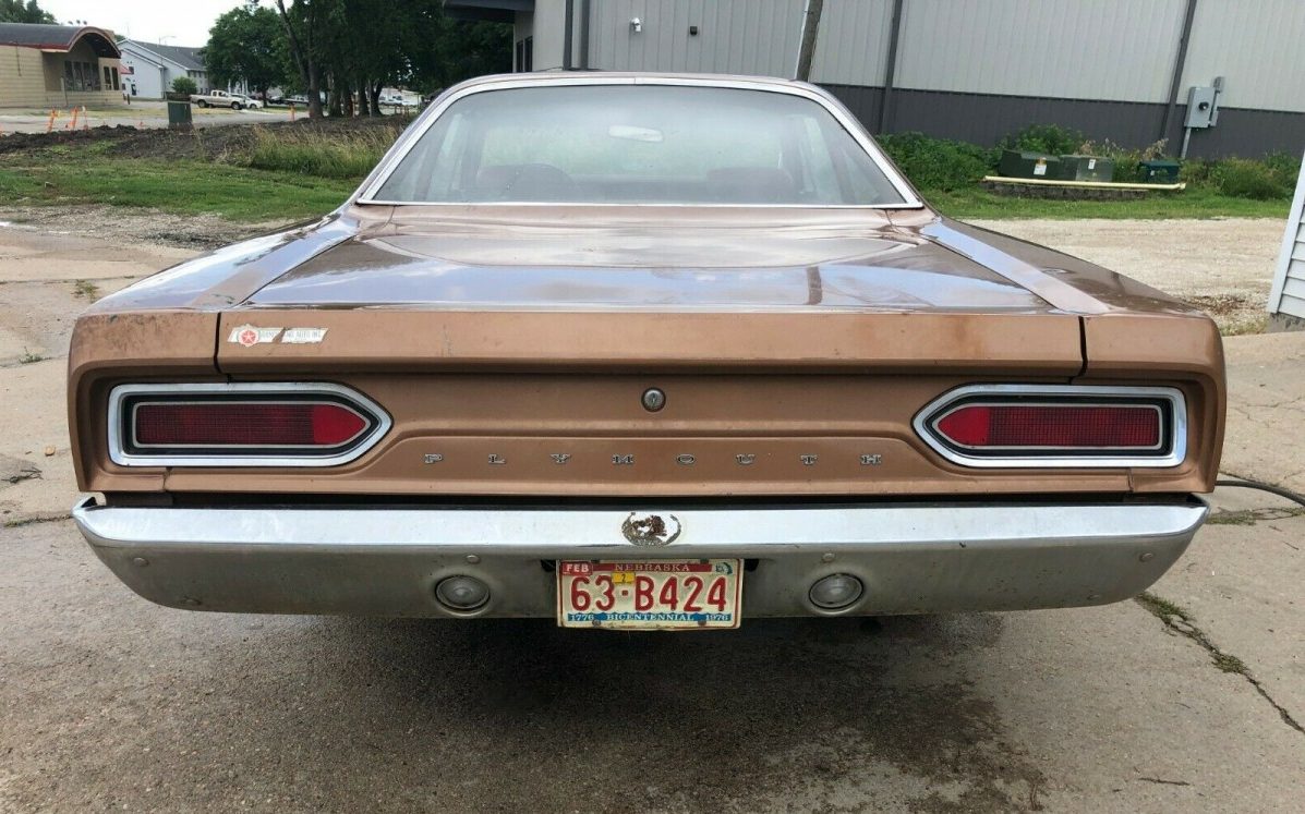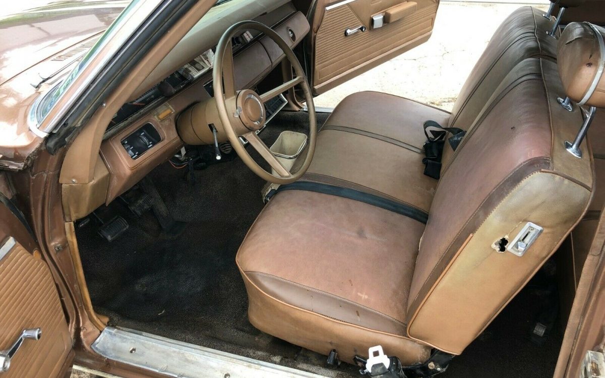 The body of this Belvedere is in fair condition, the seller states that the trunk is rust free but the rockers and rear floor have a bit of an issue. Most notable are the galvanized metal sheets that have been riveted over the lower quarters behind the doors and rear wheels. The seller claims that “I’m assuming he did that because he lived on gravel”. I would imagine its something more than that and those skirts are probably hiding a surprise. Actually, the rust appears to be more than just in the rockers, the lower fenders aren’t looking too hot either. While the styling of the ’68-’70 Chryco “B” body intermediates is great, they are known rust magnets. The copper-toned finish is pretty flat and worn, about what you would expect for a half-century-old car.