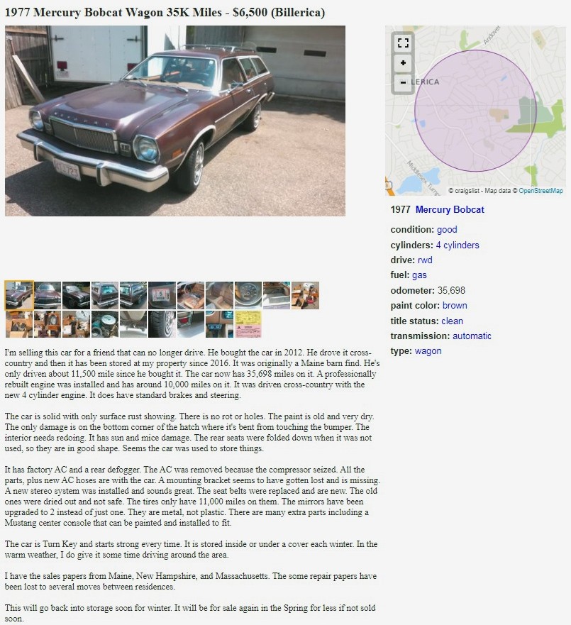 Said to have been a Maine barn find, the seller is listing this 1977 Mercury Bobcat Wagon for a friend who no longer drives. The friend bought it in 2012, drove it cross-country, and then has stored it at the seller’s place in Billerica, Massachusetts since 2016. Oh yeah, it only has 35,698 miles. It’s posted here on craigslist, and they’re asking $6,500. Here is the original listing, and thanks to Barney for the tip!