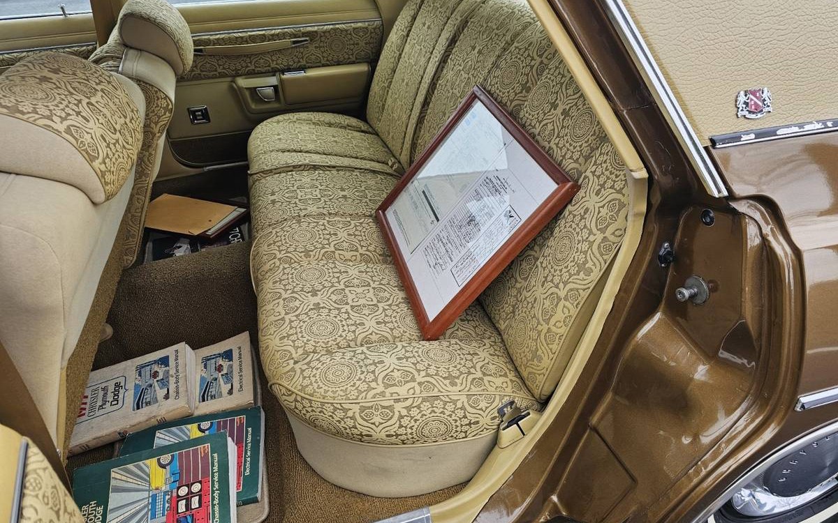 That is the epitome of 1970s Interiors for sure. This big old Chrysler is very clean and in remarkable condition I also like the framed paperwork on that fancy back seat. This was absolutely someones pride and joy for sure. Nice find Scotty.