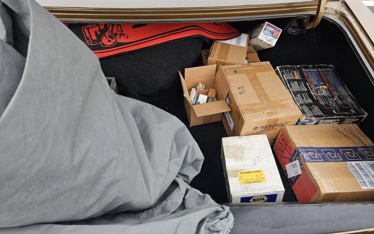 “Hey, stop yer yammerin’, SG, and show us that oh-so-fancy interior you kept harping on in the first paragraph!” Ok, you asked for it, check that out! This is 90% of the car for me, and as we all know, you’re inside your vehicle most of the time anyway, so if you don’t have an interior you like, all is lost. To say I like wacky 1970s brocade fabric is like saying I like America, apple pie, and Chev… er.. I mean Chryslers. This 50/50 Williamsburg cloth power front bench seat with vinyl accents appears to be in like-new condition, and this interior is loaded with power options, even better! The back seat makes me want to weep like a child; it’s so beautiful, and the trunk is filled with extra parts.