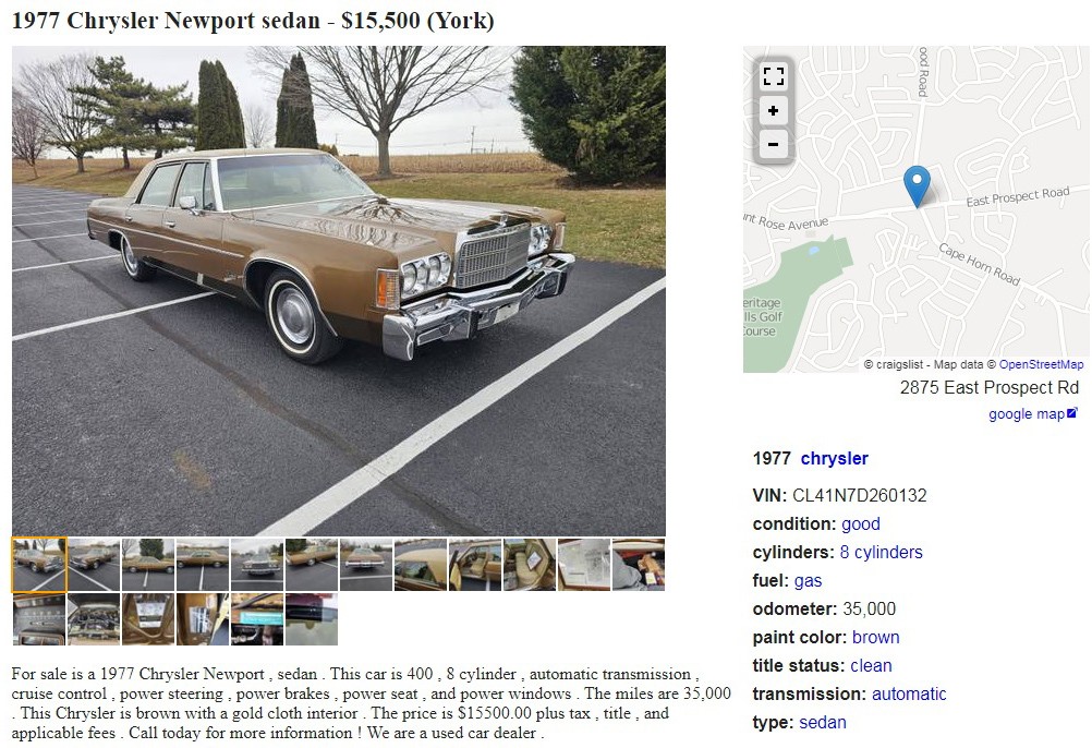How can such a sedate, some might say boring four-door sedan have such appeal today? For me, the interior is the big part. Well, actually being almost 19 feet long is a big part, too, but once you see the interior, you’ll either agree with me or say it’s ugly. This 1977 Chrysler Newport is posted here on craigslist in York, Pennsylvania, and the selling dealer is asking $15,500. Here is the original listing, and thanks to Dennis H. for the tip!