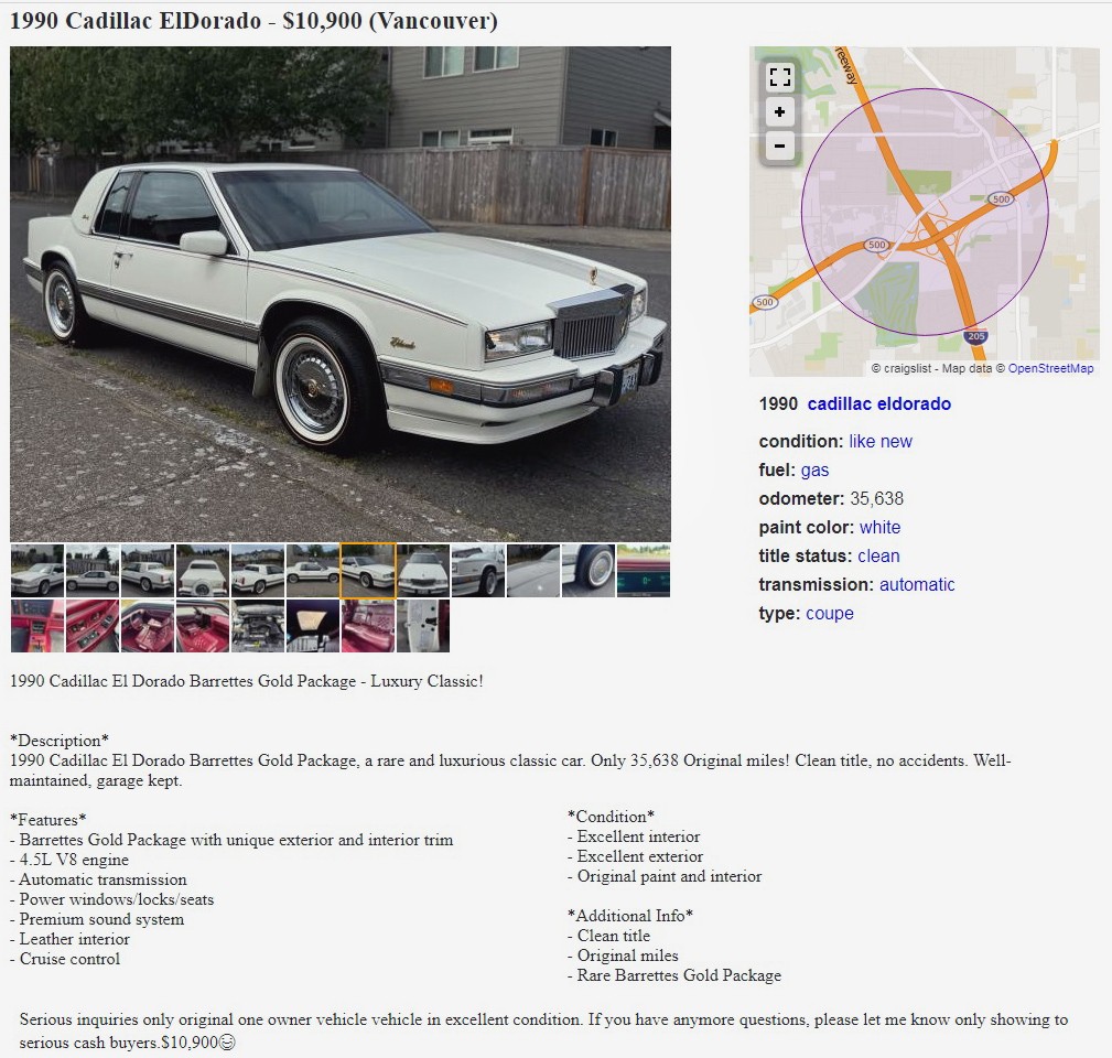 If it weren’t for the first five generations of the Buick Riviera, GM’s E-body cars would have been all front-wheel drive. How’s that for worthless trivia? Are you ready for another? They were all two-door personal luxury cars. It didn’t get more luxurious than this 1990 Cadillac Eldorado Biarritz that the seller has posted here on craigslist in Vancouver, Washington. They’re asking $10,900 for this low-mile gem. Here is the original listing, and thanks to Curvette for the tip!
