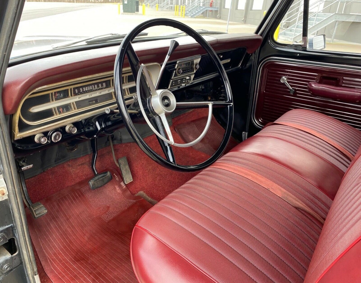 Beautiful pickup, in and out. Not a huge fan of a black exterior but it looks good here and really makes the trim stand out. Similar to a ’72 I once had, a truck that served me well. The red interior looks good and is a nice contrast to the black exterior. PS and PB are a nice touch and though it doesn’t have A/C, that can be added if so desired. I really like this pickup and I believe it will fetch good money at auction’s end.