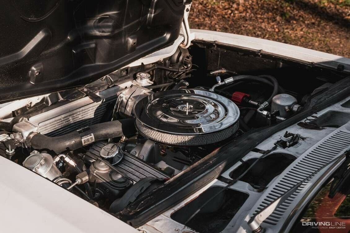The wheels appear to be black painted Pontiac “Snowflakes”. This looks like a well done swap, although I’d prefer to see a dust cover installed over the torque converter. Will make someone very happy! GLWTA!! :-)