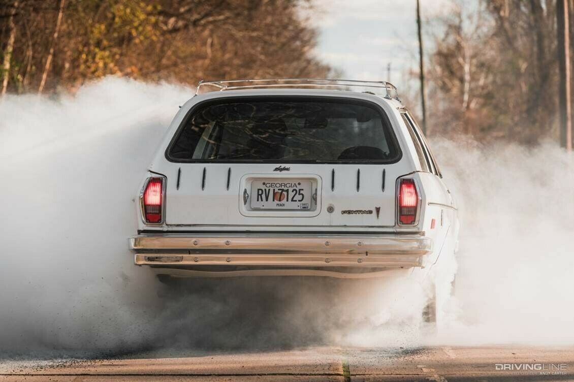 As you can imagine, that much power in a light car can be a lot of fun. This picture shows the Sunbird Safari Wagon lighting up the rear tires in smoke. The white paint looks to be in fair condition and the odometer reads only 62,000 miles. The ad states that the exterior paint is original. The interior of the car looks to be in very nice shape and has red vinyl bucket seats. Aftermarket gauges are installed under the dash. The Sunbird Safari Wagon has power steering, power brakes, and a positraction 3.42 rear gear ratio in the rear end.