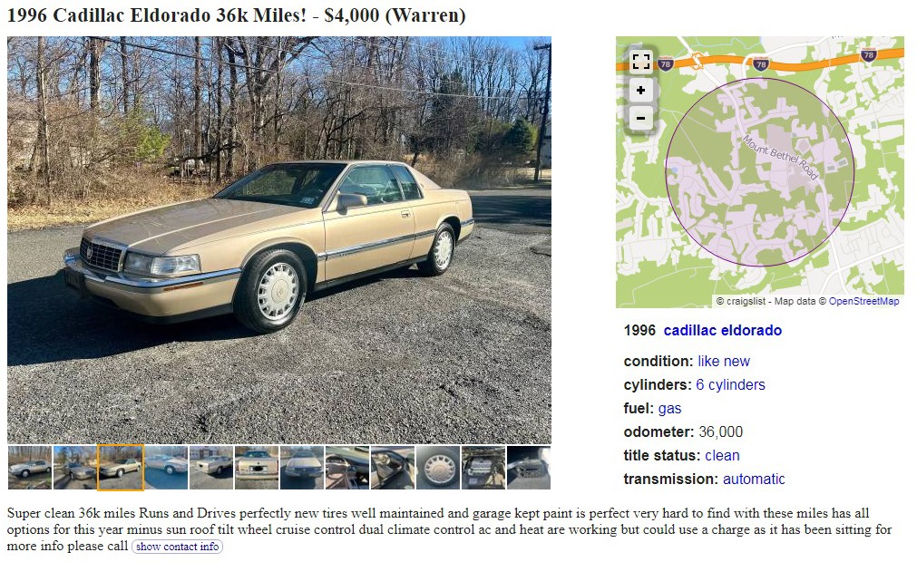 UPDATE – This is a strange one. This 1996 (?) Cadillac Eldorado is listed for sale again after it was featured last April here on Barn Finds. The weird part is that it was listed then as a 1994 Eldorado, not a 1996! It’s posted here on craigslist and is still supposedly located in Warren, New Jersey. The seller, whether it’s the same one or not is a mystery, has dropped the price from $5,500 down to $4,000! It’s two years newer and $1,500 cheaper, will it sell this time? Here is the original listing, and thanks to Mitchell G. for the tip, again!