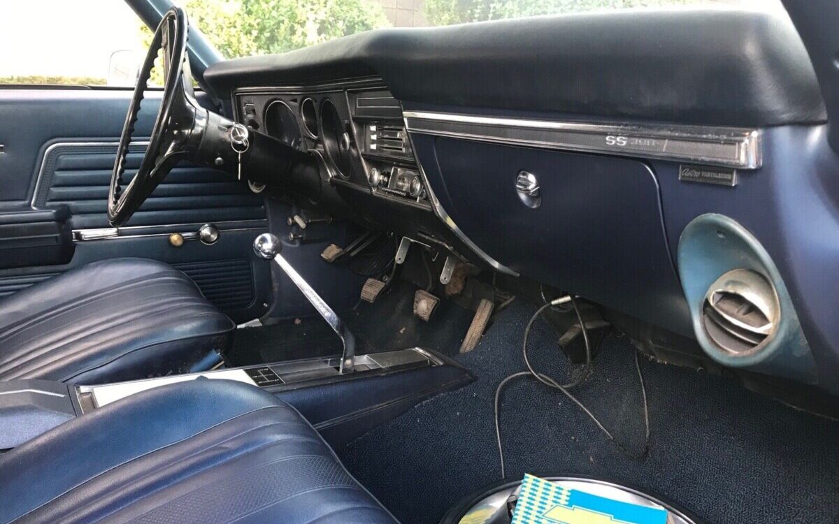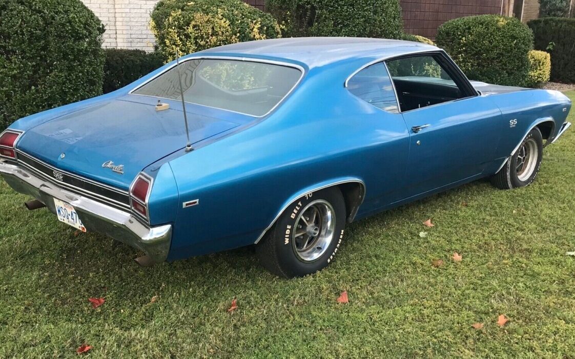 The mo-jo residing under the hood is a 375 HP (RPO L78) 396 CI V8 engine. The illustrated “JD” block stamp code does equate to a four-speed manual transmission version of this engine as used in a Chevelle or an El Camino. Additionally, the engine’s sequence number, 351292, matches the last six numerals from the VIN. Under the proper divorced choke Holley carburetor, which is wearing the correct dual feed fuel line, is a required Winters “snowflake” aluminum intake manifold. Yes, the whole shebang it looks genuine which means that this is one of about 9,400 SS396 Chevelles assembled in ’69 that bore this engine. They are really not rare, but they sold extremely well for a $252 option that was never advertised or promoted. It sounds as if this 24K mile example (supposedly documented) yard drives with a gas can – the fuel system will need a flush. There’s just one small item, the engine appears to be painted blue and that doesn’t add up, why? All the seller says, is, “Not sure why the engine block is painted what looks like ford blue“. At the least, I would insist on removing the valve covers to verify that this engine is wearing the correct “HI-PERF” cylinder heads. It may be nothing but the color change makes me think that the engine has at least been out of the car once.