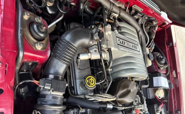 The positives continue on the outside, as the body looks about as good as any eighties Mustang I’ve spotted recently. The dark red color and black moldings work well for this style, and although it’s never confirmed that this is still the original paint, if it has gotten a respray, the workmanship seems to have been of very high quality. Those wheels are new, with the tires they’re wearing stated to have fewer than 100 miles, but the original rims also come with the sale.
