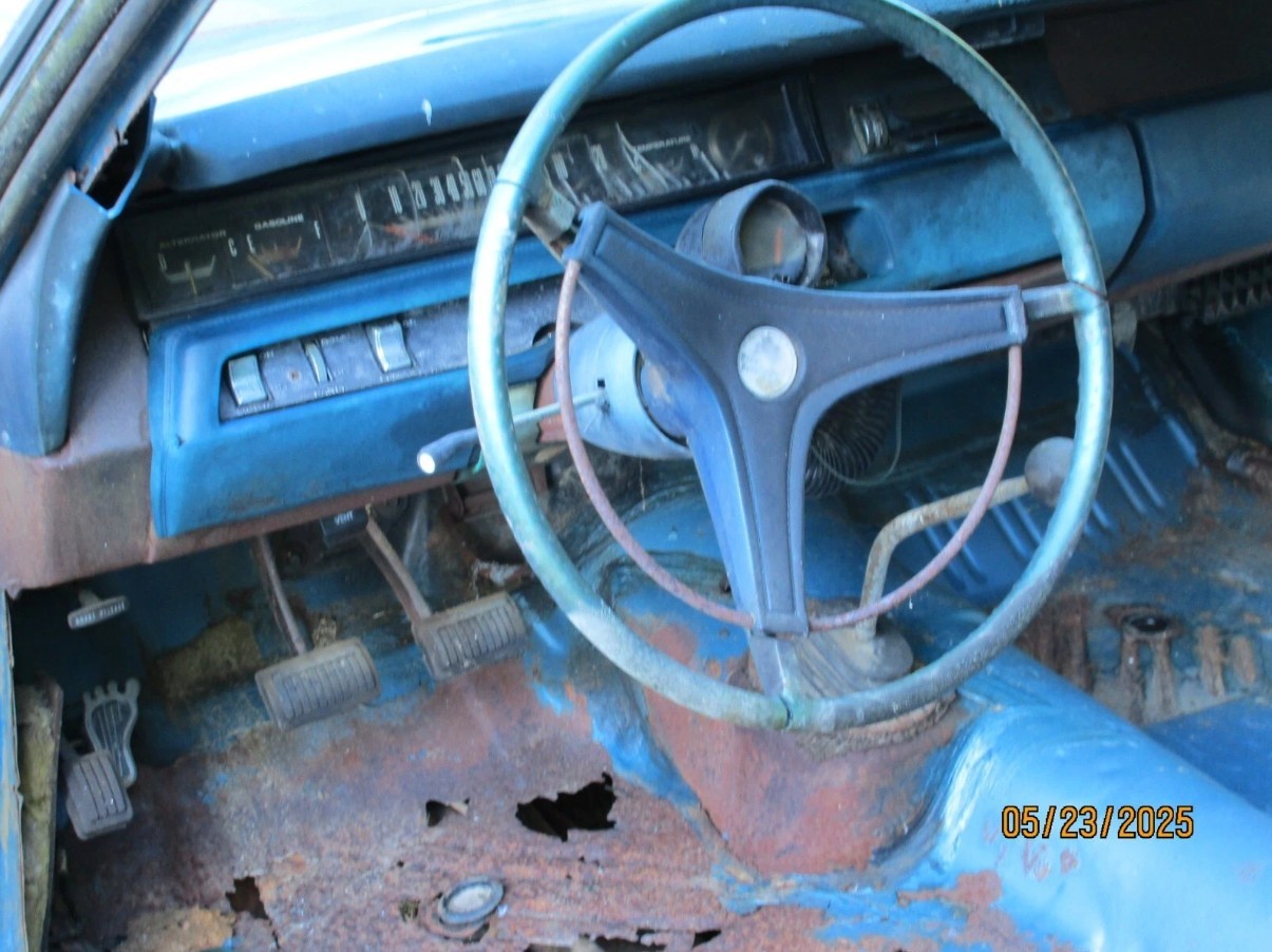 This Road Runner would have been stunning in its prime, with the Blue vinyl interior trim perfectly complementing the exterior paint shade. The seat frames are present, but this interior requires total restoration due to the lack of carpet, a headliner, door trims, and seatcovers. The dash is essentially complete and houses the factory radio, but it is another area requiring an injection of cash to return to its former glory.