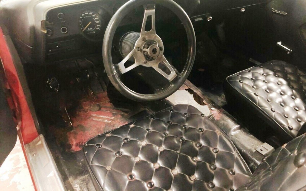 Shiny red paint covers what appears to be solid metal, the latter clearly visible thanks to the missing engine. Reportedly converted to a drag racer in the ’80s, this potent E-body appears to have enjoyed a long life of indoor storage. There are easier ways to get a clean ‘Cuda body than to take one that’s been hacked and welded up for drag-racing, but if that’s your plan anyway, this could be a good starting point. Sleep with a clear conscience after doing it your way; the Smithsonian Museum will not be tracking you down with a big offer for this rolling piece of history.