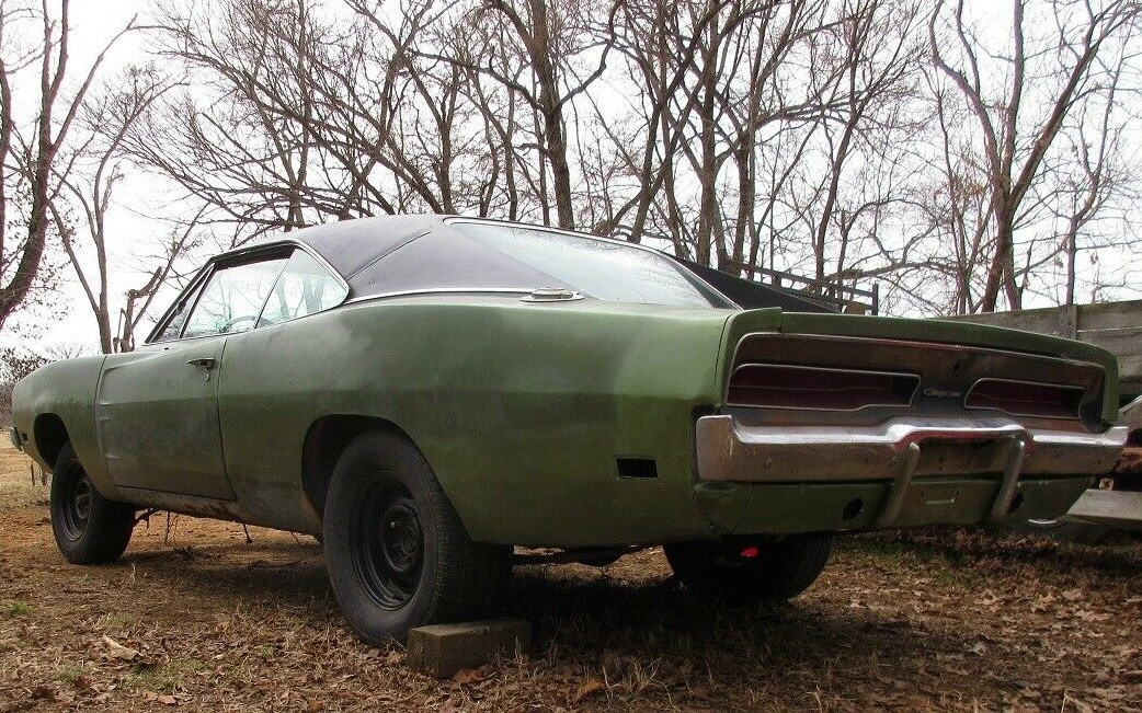 This Charger was originally and still is an F5 Medium Green color car and was indeed factory equipped with the SE package, as indicated by the A47 on the car’s fender tag. The seller says the vehicle is fairly complete, and although not shown it does come with a decent ’69 Charger hood. The doors and fenders are said to have limited rust, but other body parts like the quarter panels, taillight panel, portions of the roof, and some other areas are going to need attention. There’s also body filler mentioned in some outside panels.