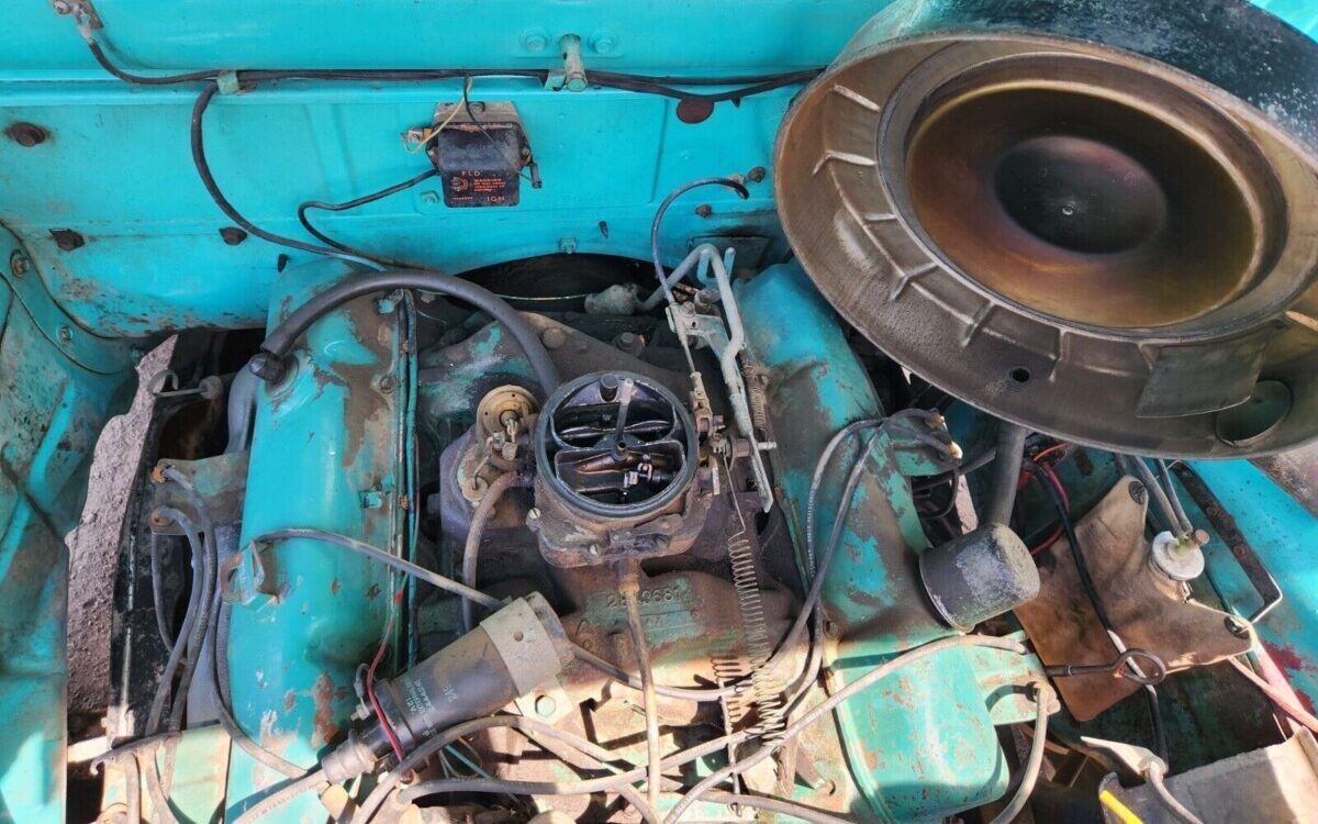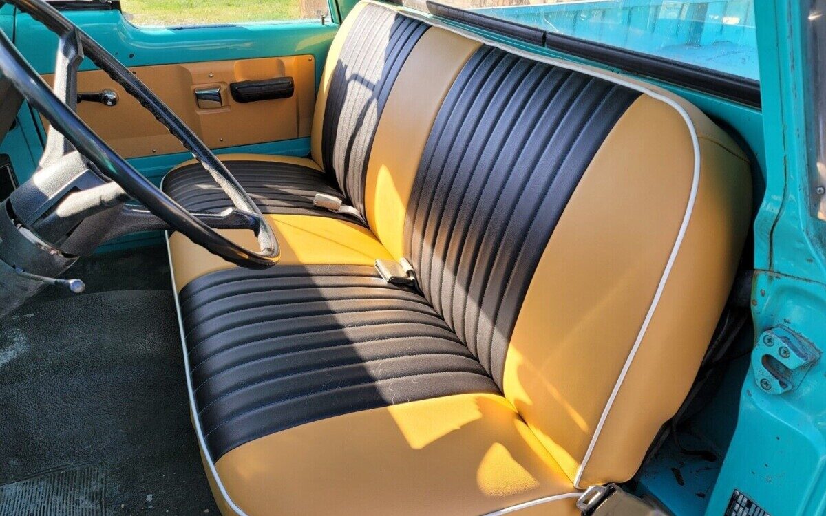 Considered a good, dependable driver, the seller states, “The paint is original including lots of patina (including the very rare optioned textured vinyl top look white cab top!)“. What paint is there, a sort of hospital ward green, looks surprisingly strong, at least in places where it hasn’t either rubbed off or has been overtaken by rust, such as the rocker panels. There are no images of the cargo bed but there is one of the floor in the cab and rust has pretty well taken out the steel surrounding what looks like a frame attachment bolt. Beyond these items, the body is reasonably straight and is representative of a truck that has worked its entire life.