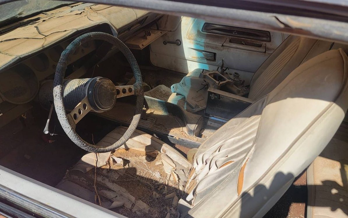 As for the interior, it looks as if someone took a string trimmer to it. It was white, or parchment, at one time but there’s not much left now. It’s hard to decide what’s more amazing, the amount of what looks like mud on top of the dash, or the Grand Canyon cracks in the dash pad that are so evident. One interesting item to note is the aluminum intake manifold sitting perched on the passenger seat – I wonder what it fits, a 383 maybe…