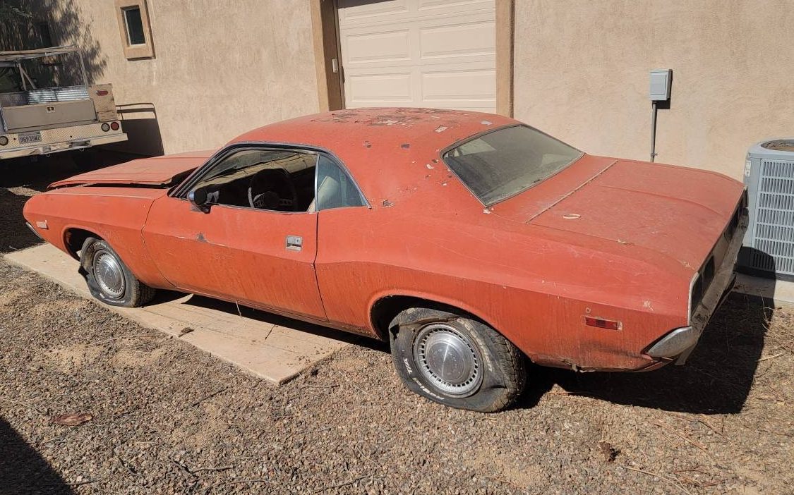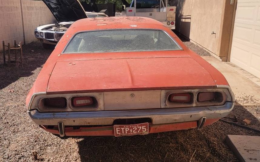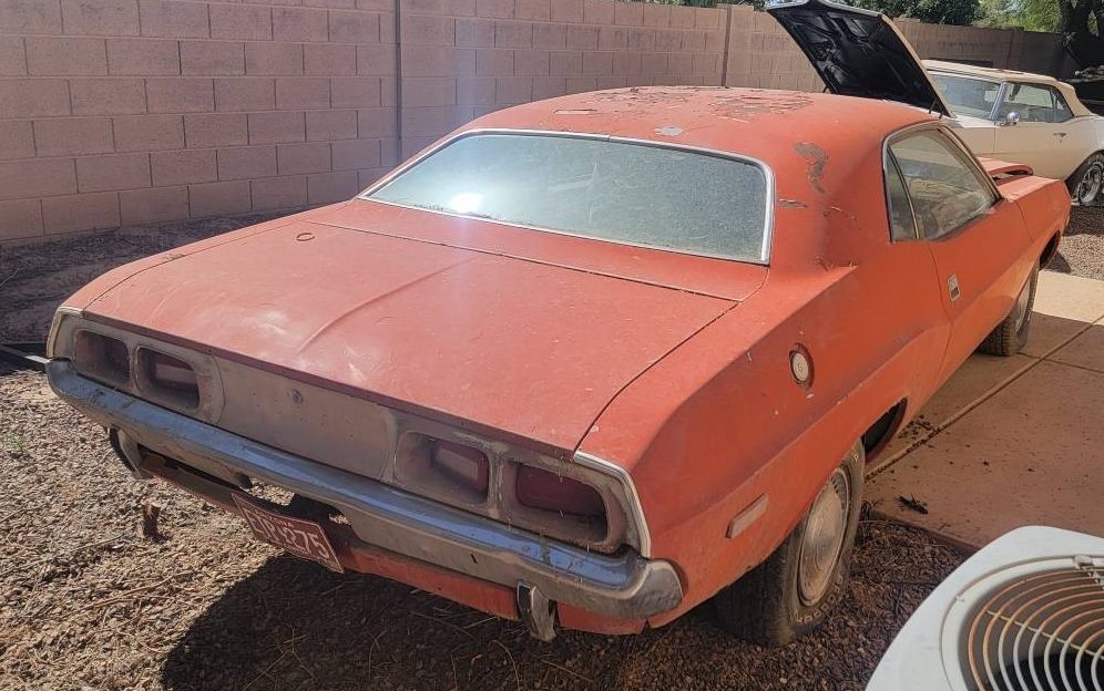 It is stated that this Challenger has always been an Arizona car – it looks it! The Hemi Orange finish has turned to chalk and the roof is showing some blistered rust patches, ostensibly where the southwestern sun has burned through the paint, exposing the underlying steel surface. Rust or rot-through is not apparent but there is a dent or two marring the sheet metal and side beltline. The rear valance plastic panels are delaminating, no surprise there, and the plastic has more than likely become quite brittle. The full wheel covers/white letter tires are not an everyday observed combination. Usually, Dodge Rallye Wheels, Road Wheels, or aftermarket hoops are involved.