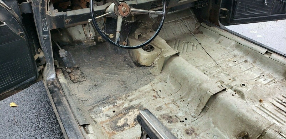 As the story goes, the previous owner took the car off the road a couple of dozen years ago to do a restoration and the work only went partway. New quarter panels were installed though one of them was not completed. The car also has a new trunk floor, extensions, a dutchman panel, and a box beam shock support. The driver’s side of the floor pan has been patched but the rest looks good as the seats and carpeting were removed. The floors were painted with a green epoxy primer to preserve the metal.
