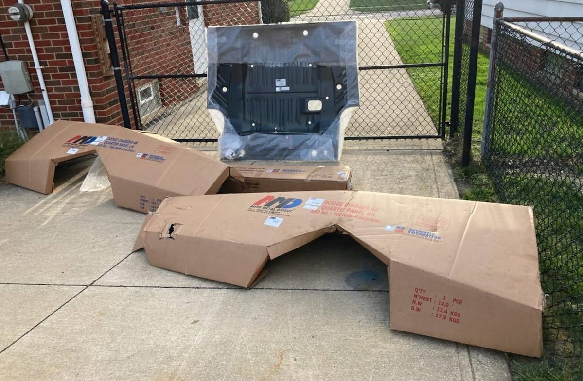 The seller acknowledges that the car has rust issues, pointing to the rear frame rails but there are no photos provided of that end of the automobile. Boxes show two new rear quarter panels and a floor pan, so those must be areas that need attention, as well. The Charger Red (?) paint has given up the ghost, there are no remnants of the car’s vinyl roof that were installed on 75% of Chargers sold that year, and the driver’s side fender and bumper are bent.