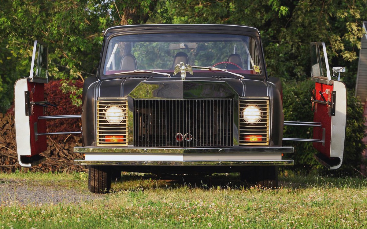 You can see how boxy the SafariKar is. It’s a true handbuilt custom and there were only three of them ever made. For the record, that isn’t flat black paint, it’s stretched Naugahyde over padding which is glued and riveted over aluminum body panels on a steel framework. No, I haven’t been drinking, that’s really what it is. There is one door on each side and with a nod to side-impact safety, each door slides straight out from the sides and passengers can get into either the front or rear seats from the front or the back side of the door. That’s genius and very cool. Another great feature is the retractable hardtop, which we don’t get to see in action, unfortunately.