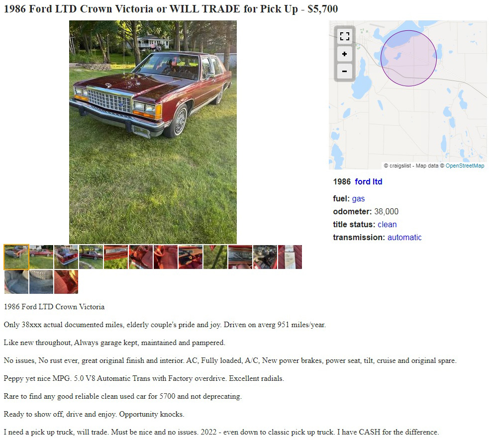 The engine has a grape juice can on it for some odd reason. Kidding. This is Ford’s 302-cu.in. OHV fuel-injected V8, which was rated at 150 horsepower and 270 lb-ft of torque when new. Power passes through an AOD (automatic overdrive) four-speed automatic and sends power to the rear wheels. They say it’s like new throughout, and it sure looks like it is. For $5,700, you could do a lot worse than this nice LTD Crown Victoria. What are your thoughts on daily driving a car that’s four decades old?