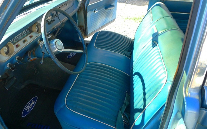 One curious thing is that they say the interior is original. I can’t imagine that these bright blue seats with white trim are original, are they? I can’t imagine that Ford used that white piping/trim in 1964. Reupholstered or original, they look great in the front and the back. The cargo area looks fairly clean other than some damage or just old age wear on one of the hardboard or cardboard side pieces. The underside looks good in several photos that they have in their listing.