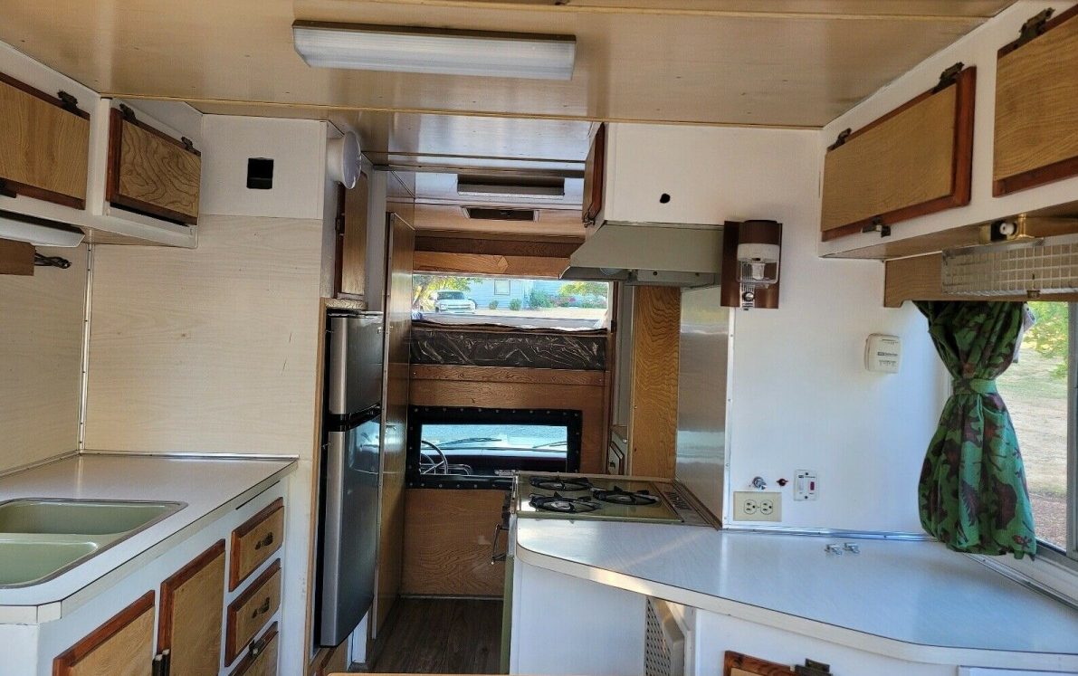 The occupancy portion of this camper, though dated, is very clean and in excellent nick; the seller adds, “Has sink, nice new mattress, propane cooktop, furnace, electric refrigerator“. OK on the mattress if it is new and unused… As with the VW camper, spatial size realization is hard to interpret from pictures. Ford period literature states that the 159″ wheelbase Camper F-350 can handle a 14 ft camper body, while the shorter 135” model is good for a 12-foot camping container – not sure which version this is. Regardless of size, these camper bodies are never something that would be considered commodious but they’re usually adequate for the job.