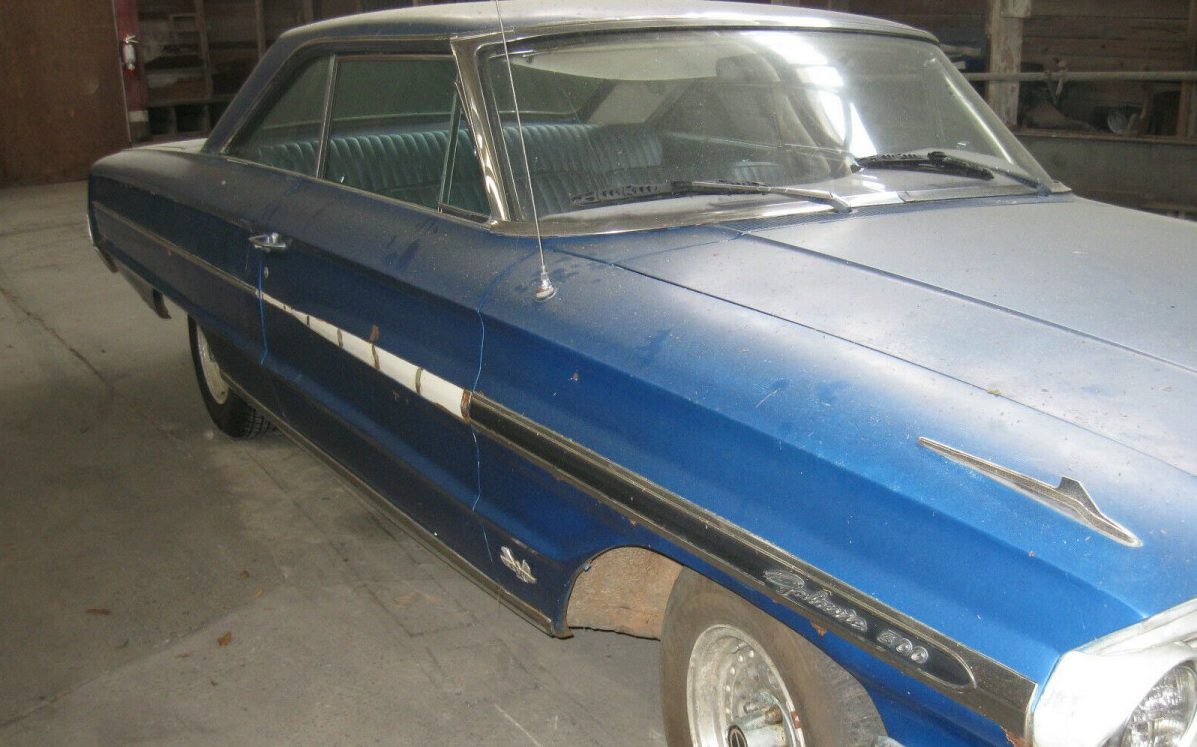 The confusing thing with this car is that the seller states that it is titled as a ’63 model and I don’t follow his explanation. The VIN clearly indicates it as a ’64 model not to mention its obvious appearance. And speaking of appearances, it still shows reasonably well. It looks like a repaint of blue over white and the finish is faded and worn but it is mostly, still presentable. The body is showing no signs of rust through, just some surface rust mingled in with complete (the passenger door spear is available, just not on the car) but dull-looking stainless/chrome. The seller indicates that there is some rust in the passenger-side rocker panel but it is not evident in any of the included images. There is no obvious evidence of crash damage or misaligned fenders, doors, etc.