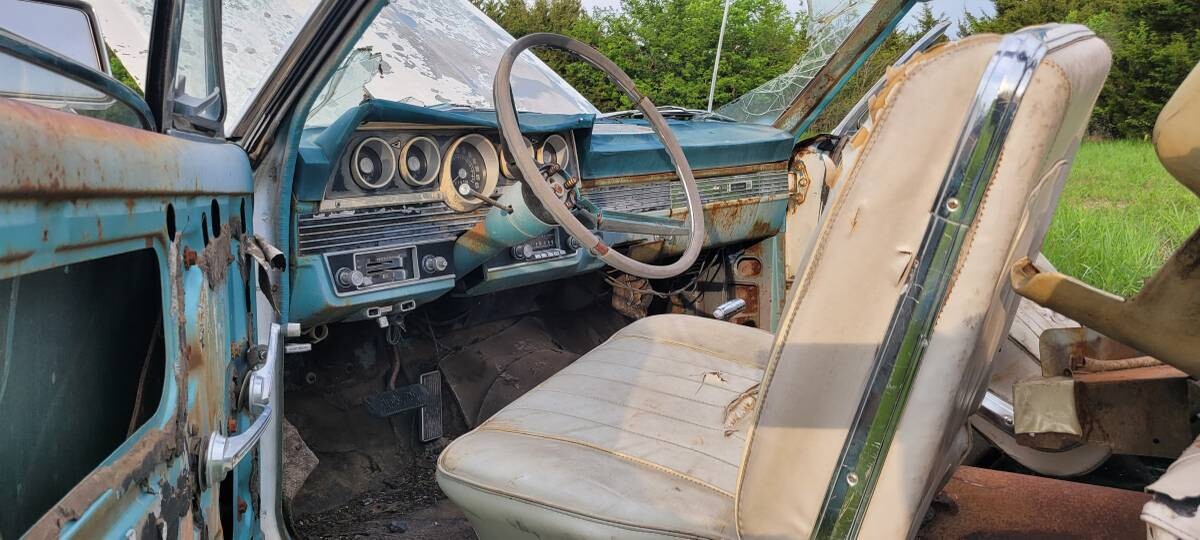 We’re told the latter engine is in the seller’s s weather-worn Merc, though finding any physical evidence is difficult given its condition. The hood is the fiberglass one that would have come with the GT, too, so perhaps that’s what we have here. This 390 is paired with an automatic transmission, but the engine is locked from sitting and we suspect the tranny will require help as well. This vehicle has likely been exposed to the elements for a long time, so the floorboards will all need replacing.