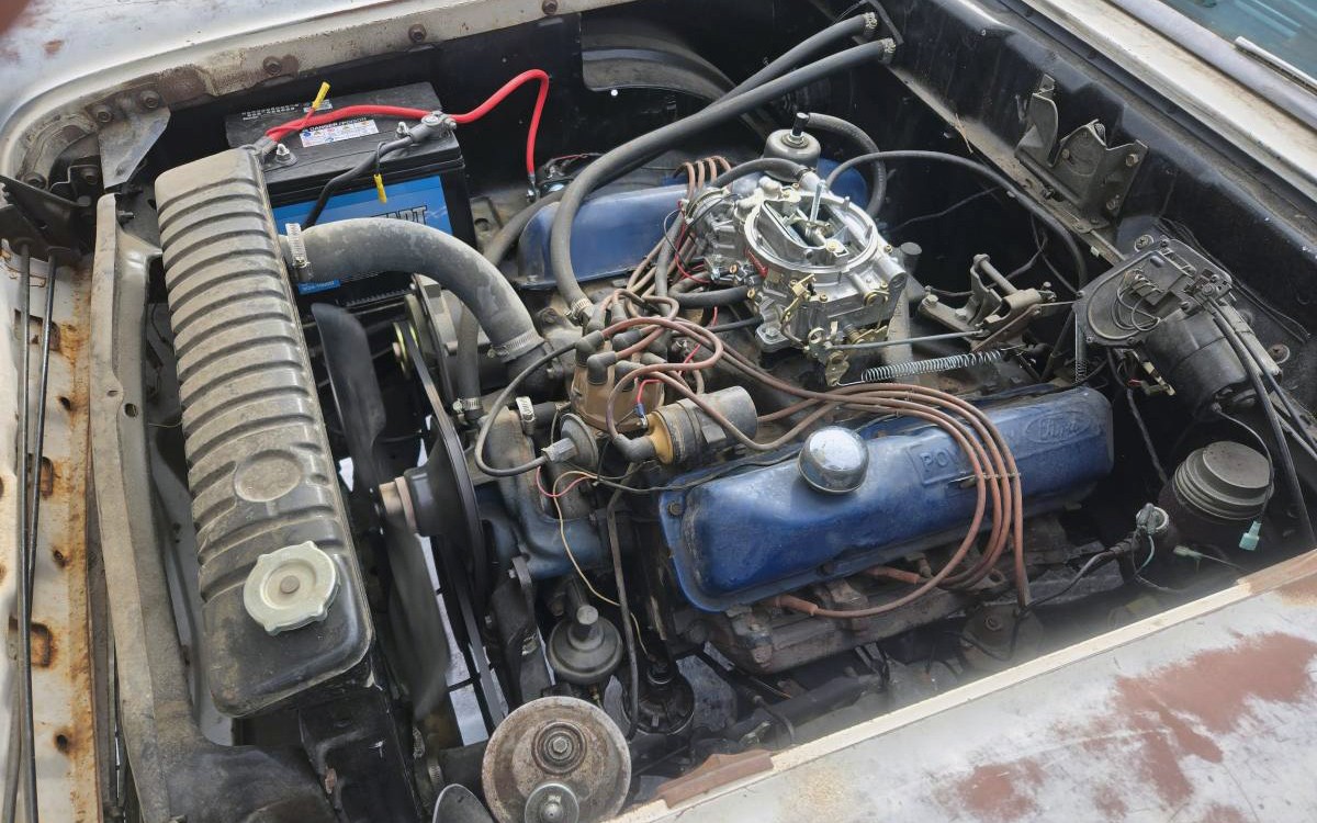 Here’s the 390-cu.in. V8 that the seller mentions. It looks nice other than the usual tangle of wires but that’s neat compared to a lot of engines. They say it’s got an Edelbrock four-barrel carb and it runs and drives, so that’s good at least. The seller lists it as having an automatic, which I’m guessing is the Ford-O-Matic, or it could be the Cruise-O-Matic. How would you bring back this cool two-door wagon? Original spec, or…?