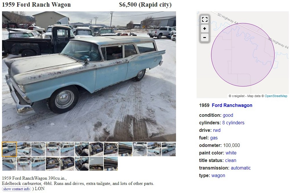 You’re right, Ford didn’t offer a 390 V8 for this car in 1959, but there’s one in here, according to the seller. Without a VIN, it’s impossible to tell what the original engine would have been but there were four choices in 1959, three V8s and a six-cylinder. The seller has this 1959 Ford Ranch Wagon posted here on craigslist in one of my favorite cities on the globe: Rapid City, South Dakota. They’re asking $6,500, here is the original listing, and thanks to Zappenduster for the tip!