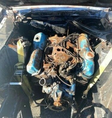 Gotta love that rear shackle sticking thru the missing trunk floor. I would be scared to see what is left of the frame rails. Hell, the car can’t even hold itself together with the assistance of ratchet straps.