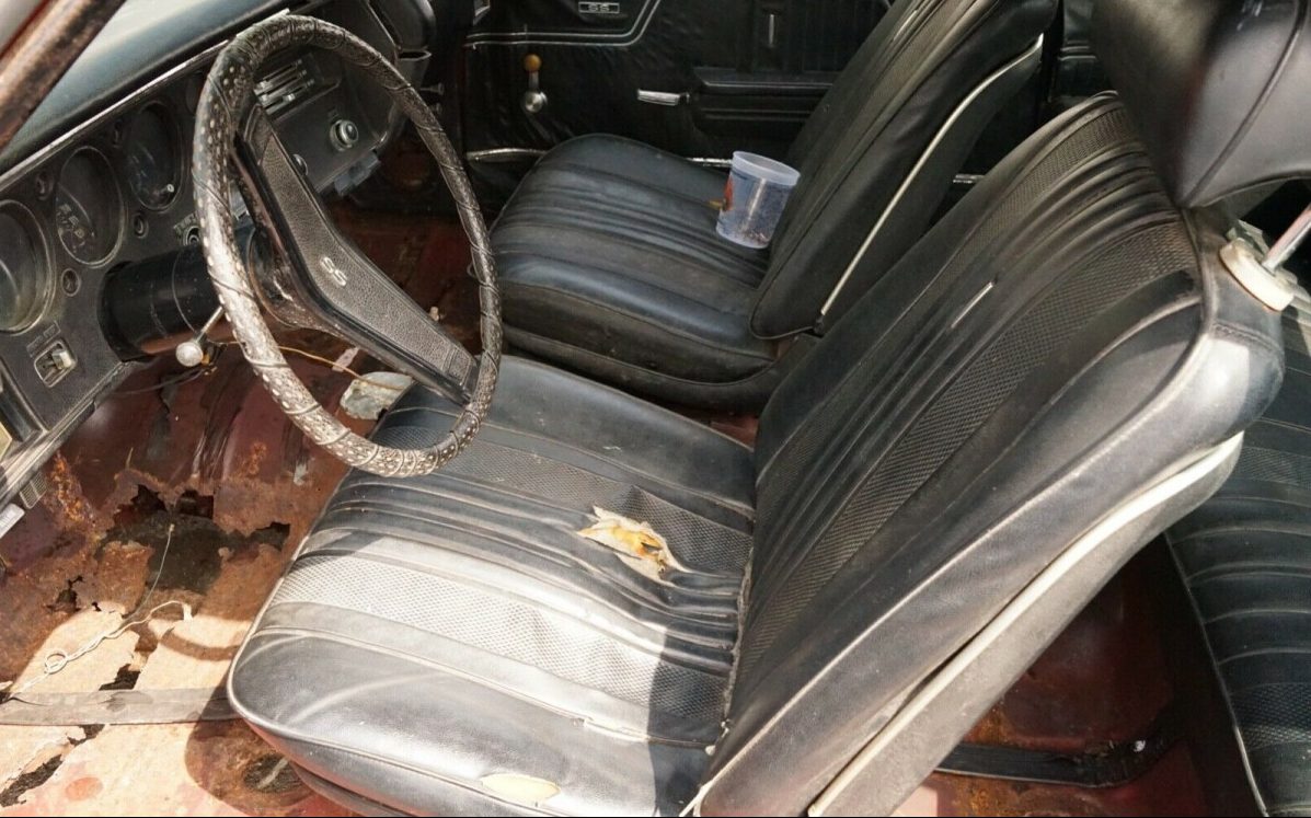 The exterior of this Chevelle appears as so many from this era do, it’s rusty! There’s a bit of rot everywhere and in some difficult-to-fix places. The vinyl top covering has been removed and unfortunately, years of trapped moisture has done what it does best, caused a corroded mess. The lower fender legs and quarters are pretty well eaten away too, a very typical problem with ’68-’72 GM A-Bodies. Curiously, the SS Magnum wheels look new and the seller advises that they have been repainted and are now shod with new (and expensive!) BFG Radial T/A tires. It’s a nice touch but it’s sort of like buying a brand new $300 pair of Allen Edmonds shoes and wearing them with a 20-year-old, thread-bare suit.