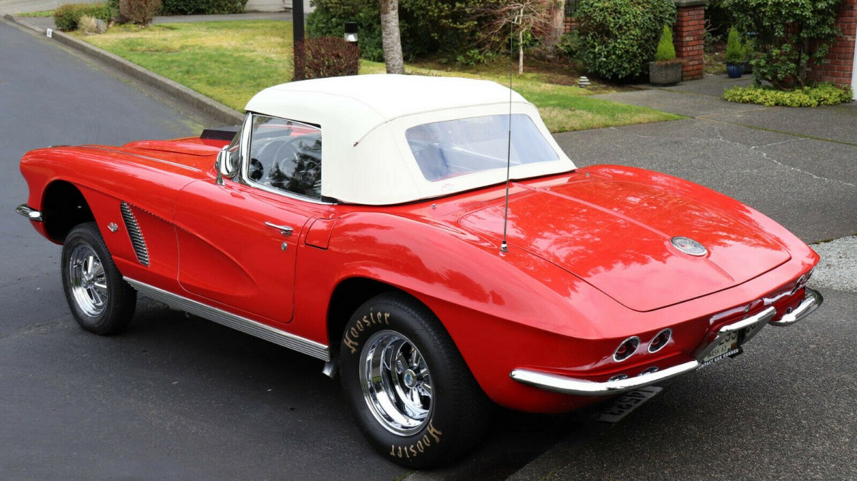It is hard to know where to start with this Roman Red Corvette because the previous owner has packed so much into this package. The seller says that around 90% of the paint is original. If this is accurate, its condition is nothing short of astounding. It shines magnificently, and it would take a true perfectionist to find much to criticize about its overall appearance. The White soft-top is a recent addition by the current owner, and it provides a striking and attractive contrast to all of that red. In keeping with the rest of the exterior, the chrome and glass appear to be flawless. The previous owner has done a beautiful job creating the classic “Gasser” stance with the vehicle, and this is perfectly topped off by an immaculate set of vintage Cragar wheels that wear new tires.