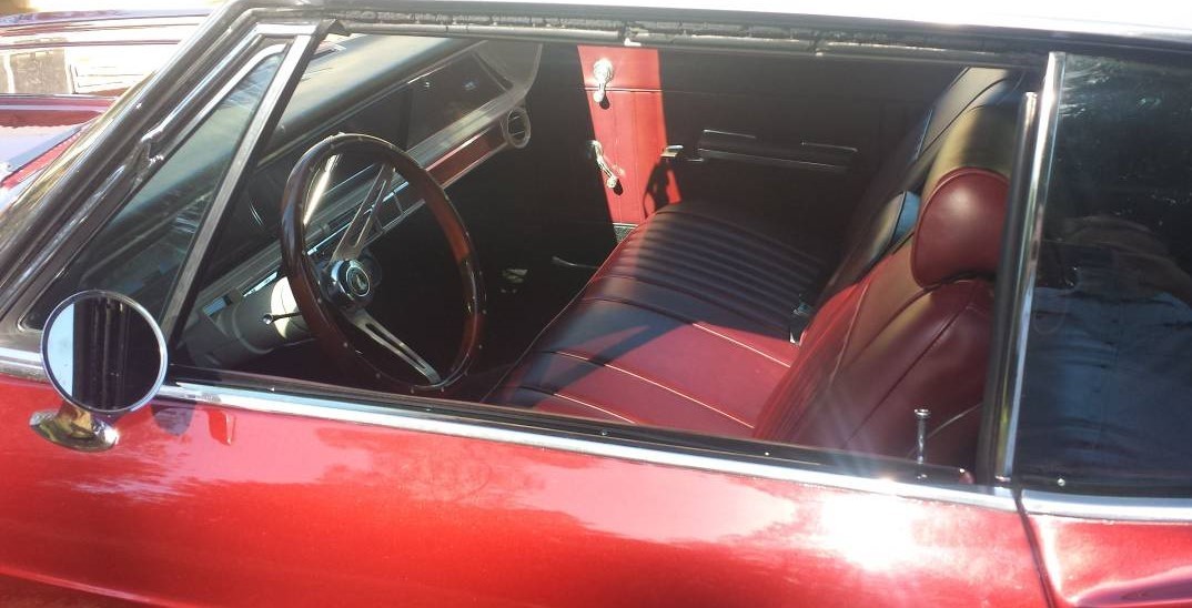 The white vinyl top over burgundy paint is very sharp and there is no evidence of rust, past or present. Inside the passenger compartment are comfortable all-vinyl surroundings. But the bench seat has headrests suggesting a more modern arrangement and the steering wheel is not stock. Shifting of the gears is provided by an automatic transmission, Powerglide, or Turbo-Hydramatic. This is a dandy-looking car, but don’t expect 100% originality. As a side note, the 1965-70 GM B-body arrangement is the fourth best-selling automobile platform in history after the Volkswagen Beetle, Ford Model T, and the Lada Riva.