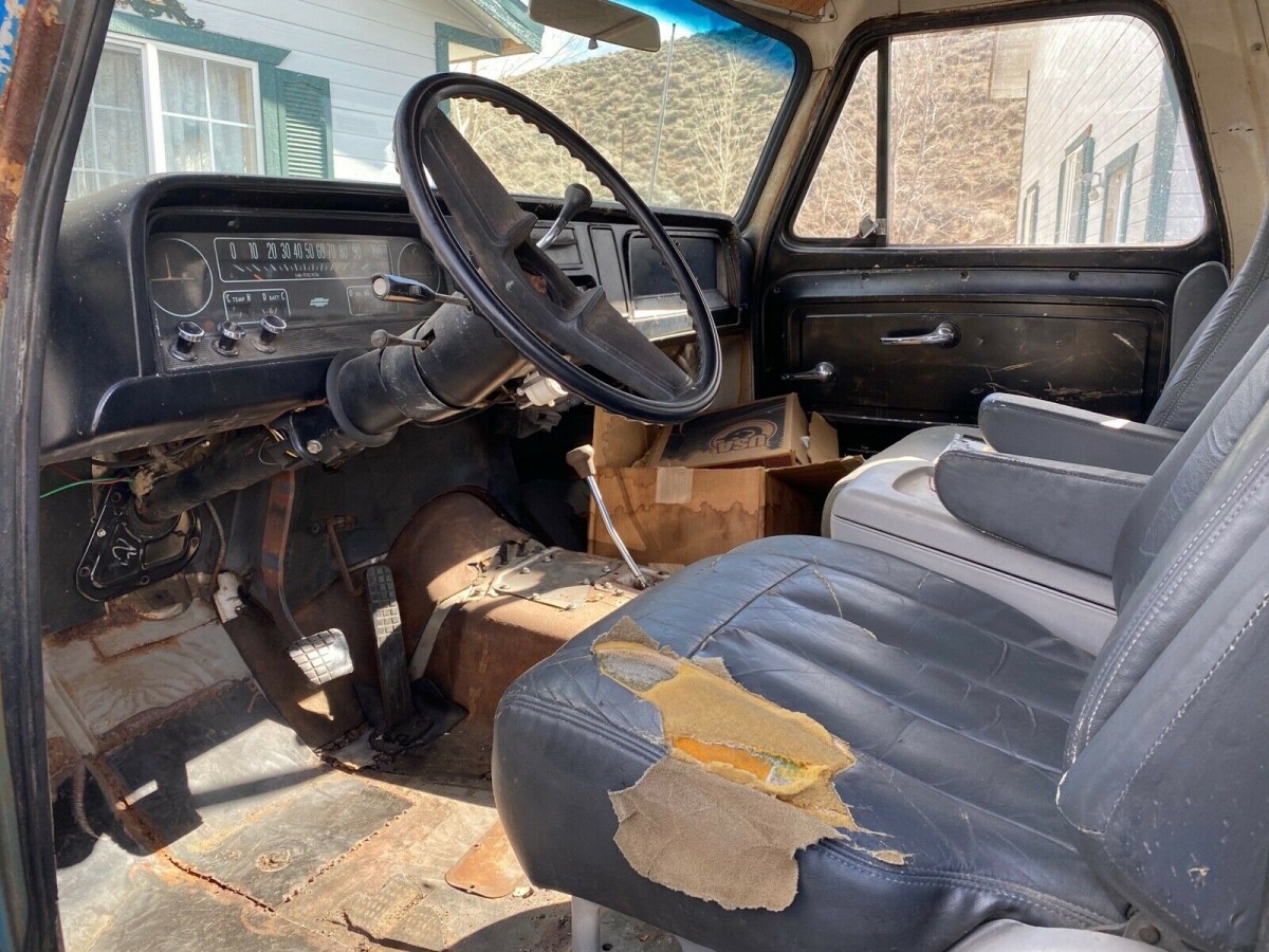 The Chevy’s body looks good for the age of this truck and we guess it was originally painted white over blue. Rust seems to be at a minimum while patina is not. A few little dings and dents are there to be found, but a little Bondo, primer, and new paint could make the truck a stunner now that it sits up high in the air. There are different wheels and tires be worn in the photos vs. the video, but the seller says what it has on in the still shots is what the buyer will receive. The interior is well-worn from front to back, including the front buckets seats, and console which both likely have come from a later model. Some new upholstery, floor coverings, and paint may take care of these issues.