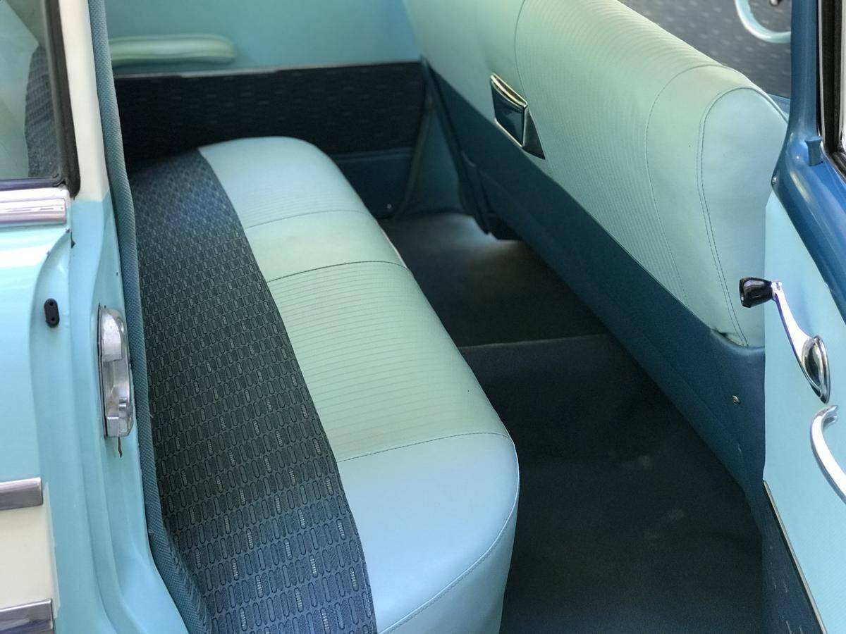 The immaculate theme continues when you open the door of the Chevrolet and are confronted with the interior. The original trim combination of Light Blue Vinyl and Dark Blue Cloth once again appears to be flawless, as do most other items inside the car. The mats look like they have some dirty marks on them, but these will hopefully clean off without having to resort to replacement. The factory radio still resides in the dash, and there have been no aftermarket additions made to the 210.