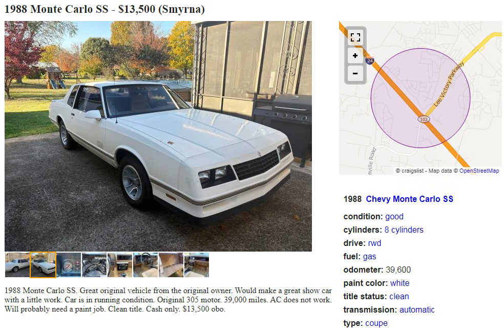 This may not be popular, but I think of the last Monte Carlo being the 1988 model as seen here. After that, the iconic Monte Carlo shape or design was gone, given way to the 1990s melted-bar-of-soap era. This 1988 Chevrolet Monte Carlo can be found posted here on craigslist in Smyrna, Tennessee, and the seller is asking $13,500 or best offer. Here is the original listing, and thanks to Barney for the tip!