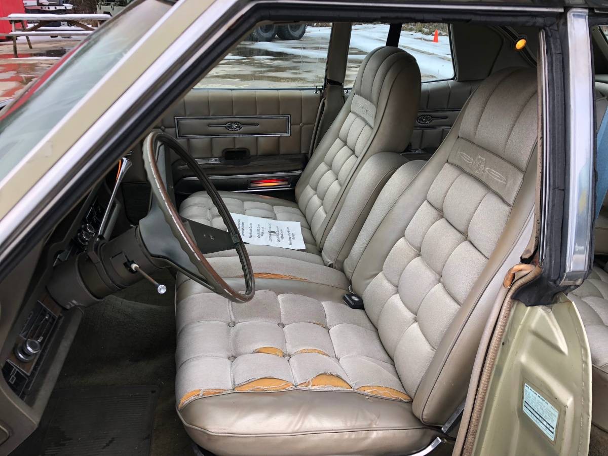 The interior is where the most help is needed. The driver’s seat is pretty much ripped up, probably due to wear and sun fading over the years. This car has the Brougham Interior Option with individual front seats in light gray gold cloth. The rear seat appears to be in good condition. The headliner, however, will need a little restitching. The car has Automatic Temperature Control air conditioning but no mention of its working status.